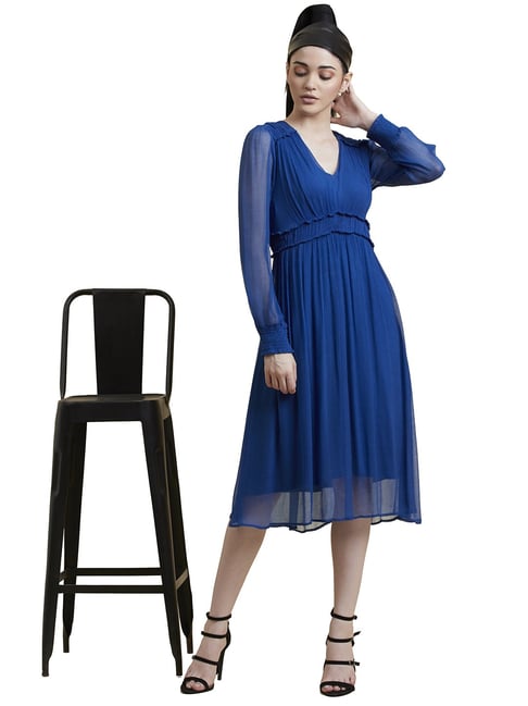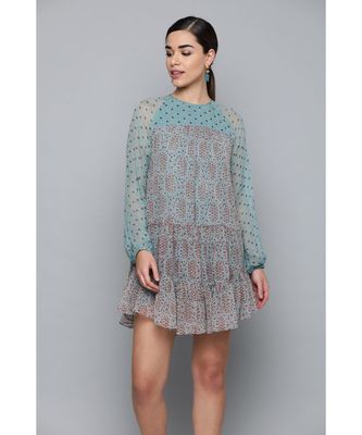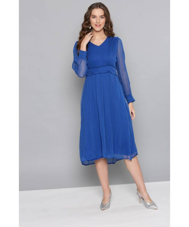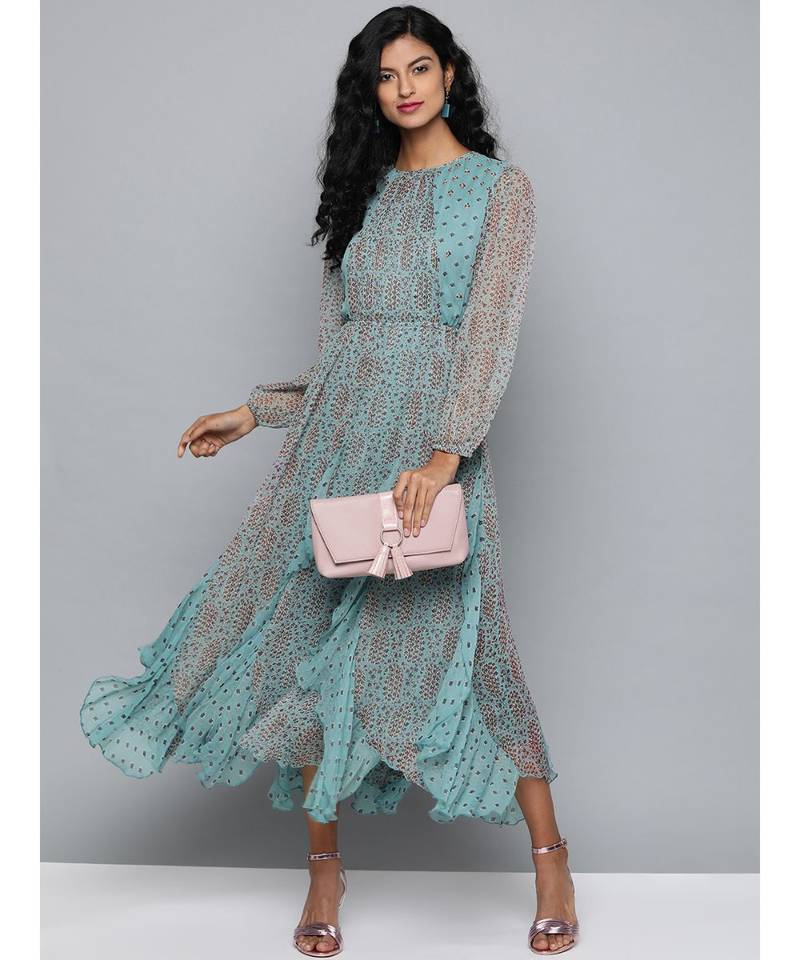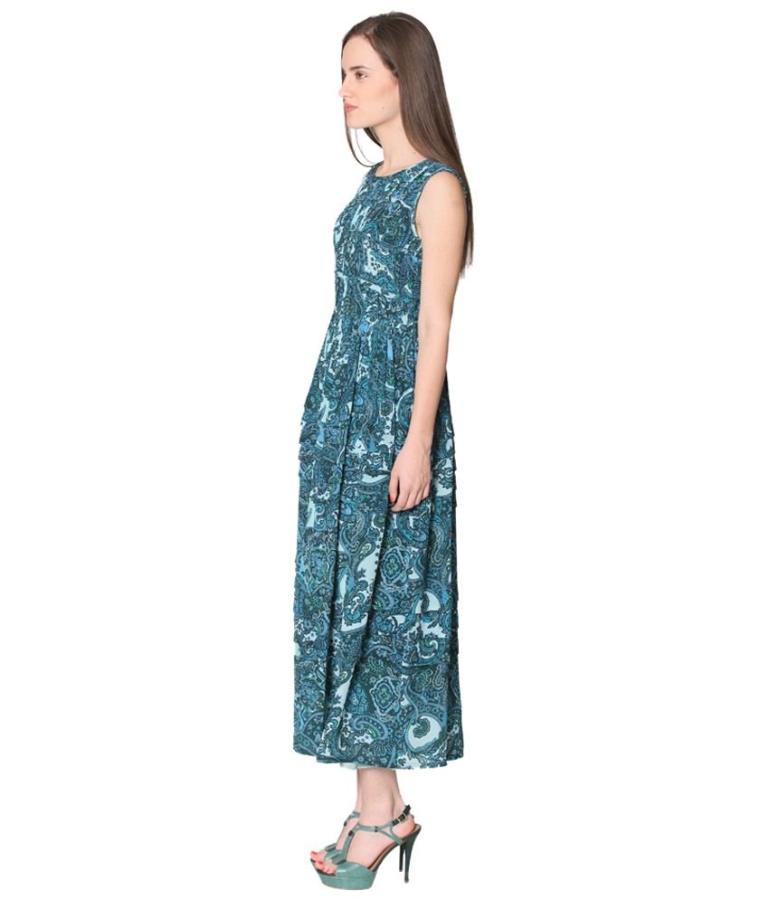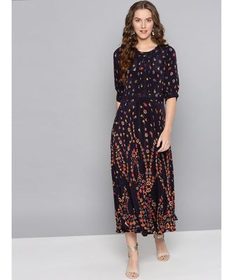 Label Ritu Kumar Blue Dress Label Ritu Kumar Blue Dress - Complete with an orange and blue floral border around the neckline, waist and hem it provides a flattering structure.