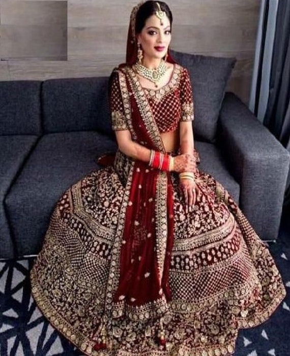 Maroon Red Pakistani Bridal Lehenga Maroon Red Pakistani Bridal Lehenga - All hand embroidery is very intricately done using kora, dabka, nakshi, sequin, pearl and diamontes.