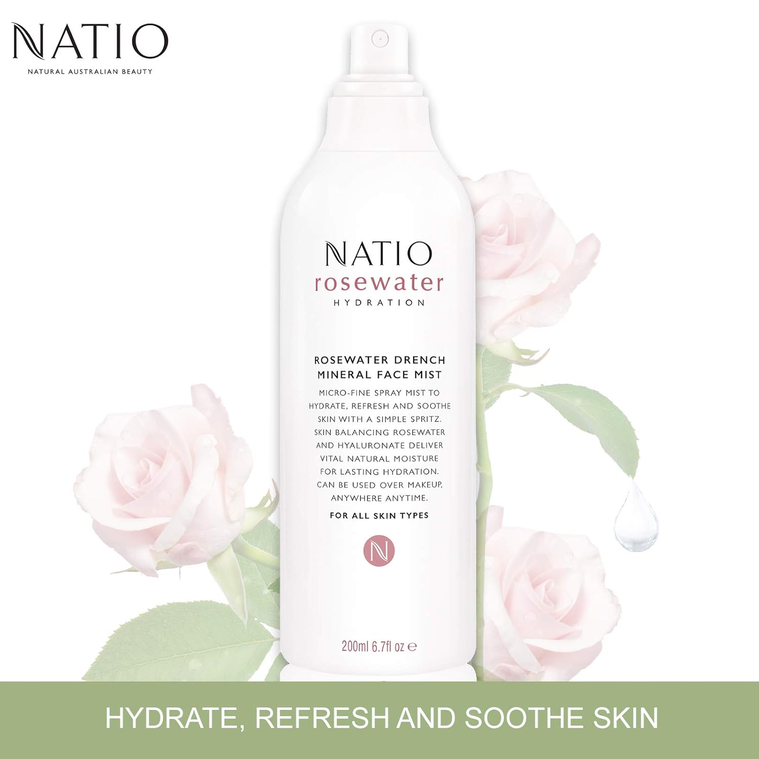 Natio Rosewater Hydration Mist Natio Rosewater Hydration Mist / Skin balancing rosewater and hyaluronate deliver vital natural moisture for lasting hydration.