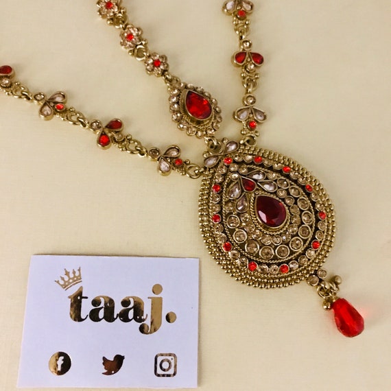 Red Matha Patti Red Matha Patti - A gorgeous matha patti with falling pearl details is all you need to complete your look!